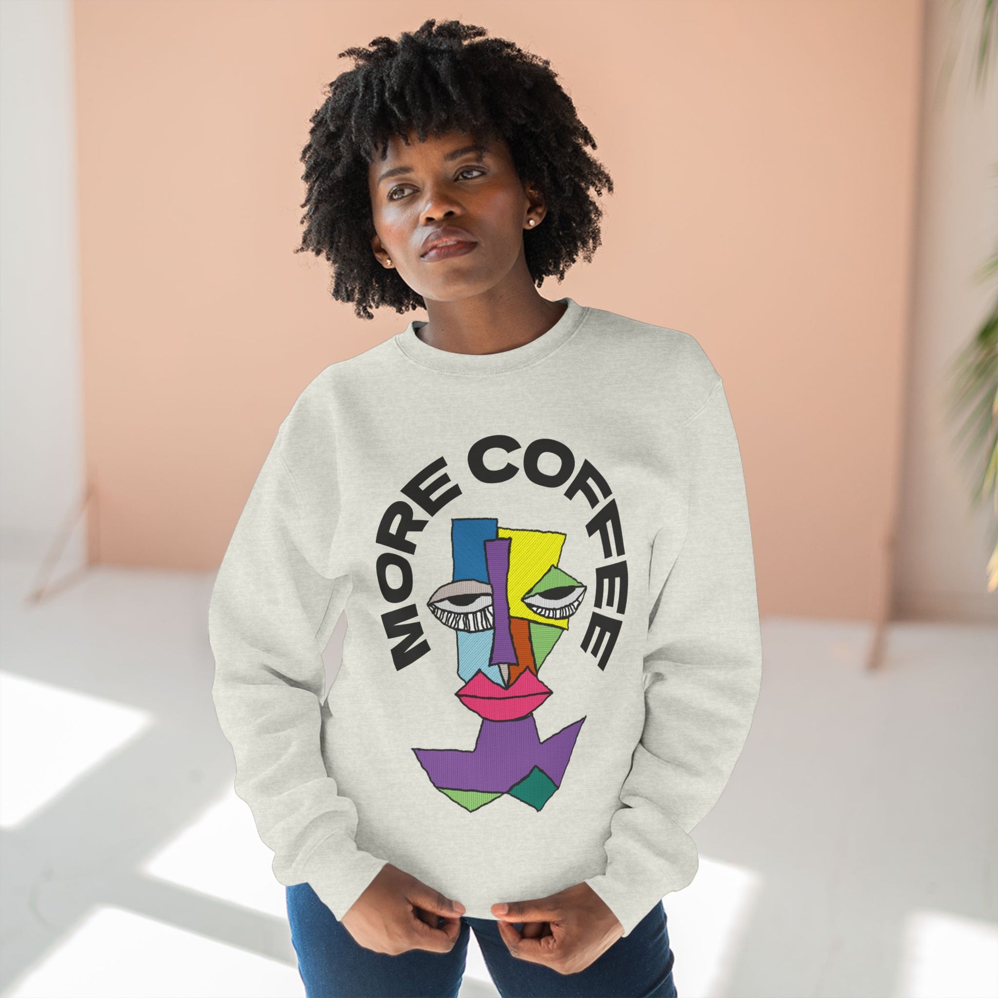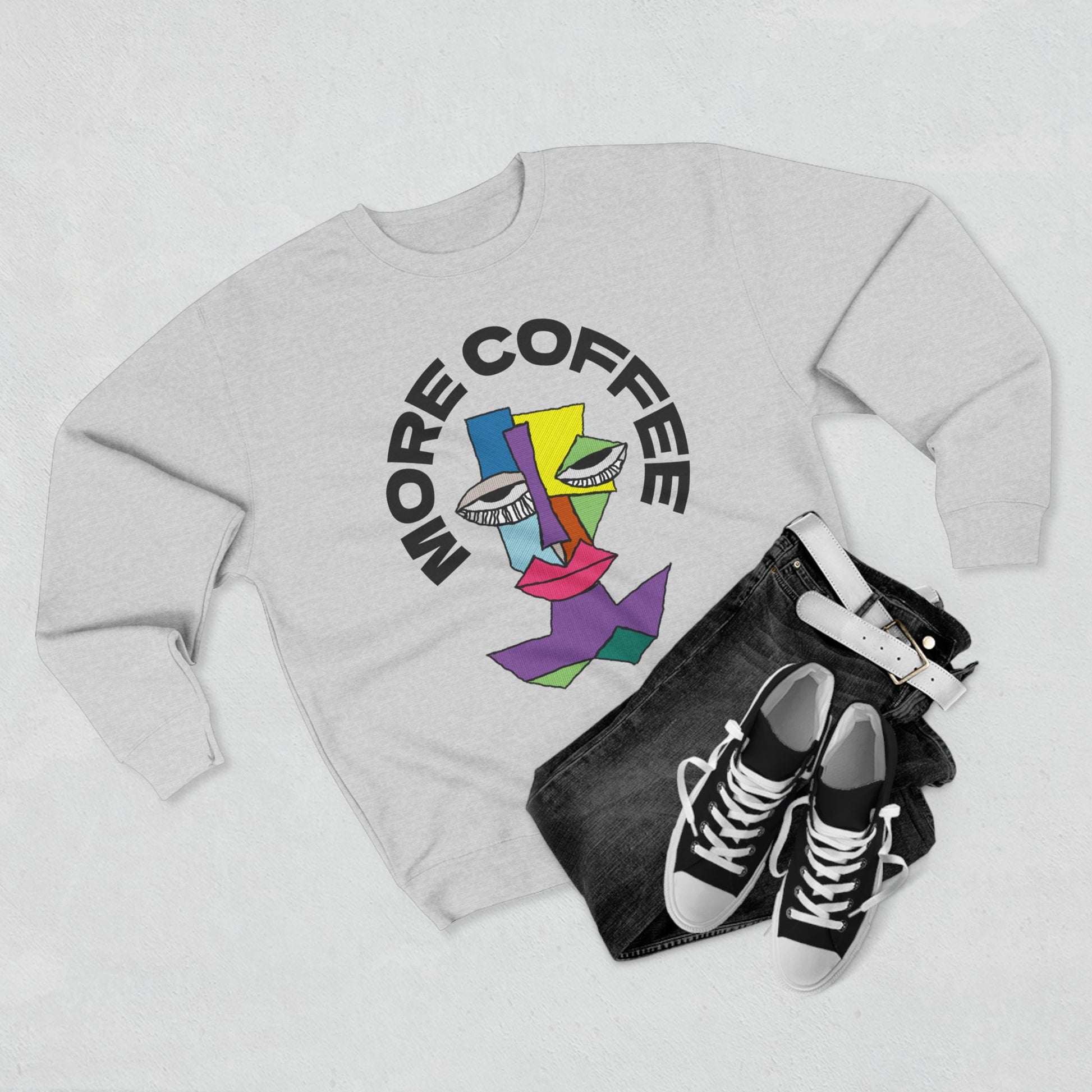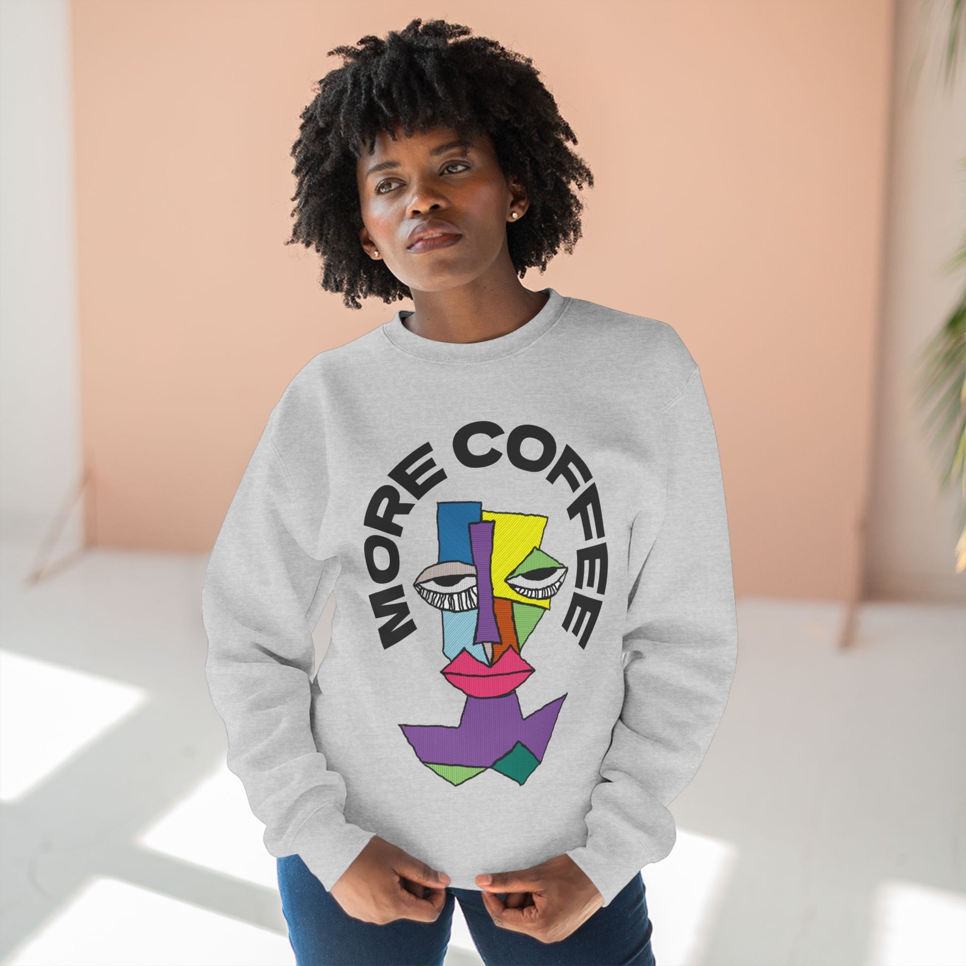 Stay cozy and relaxed with this unisex crewneck sweatshirt featuring a sleepy character diagram and the words 'More Coffee'. Perfect for lounging around the house or running errands on a lazy day. Ideal for coffee lovers or anyone who enjoys a good nap. Great for casual wear during fall and winter seasons.