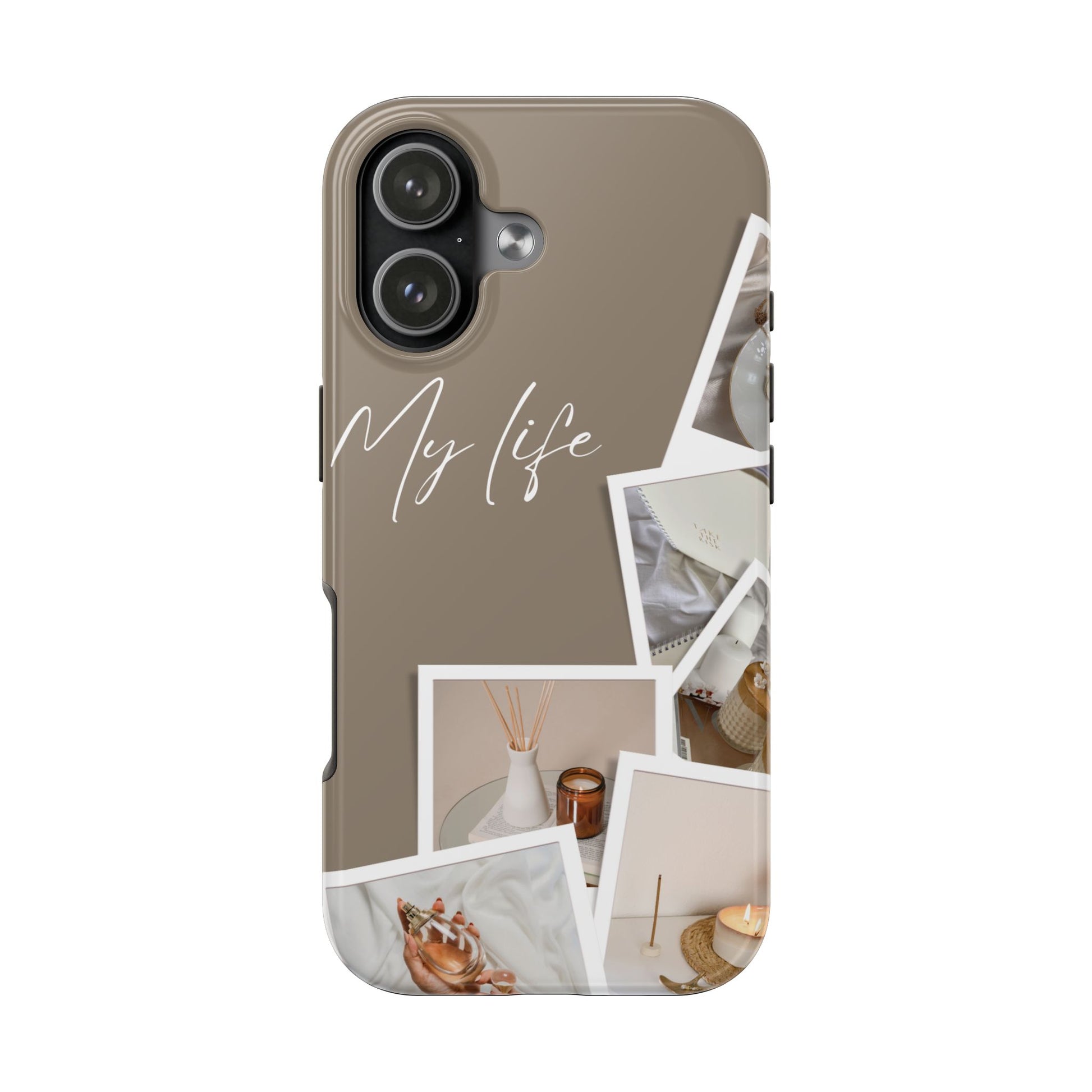 Neutral Aesthetic Phone Case with “My Life” Text and Polaroid Style Collage – Minimalist Beige Design for Cozy Lifestyle Lovers