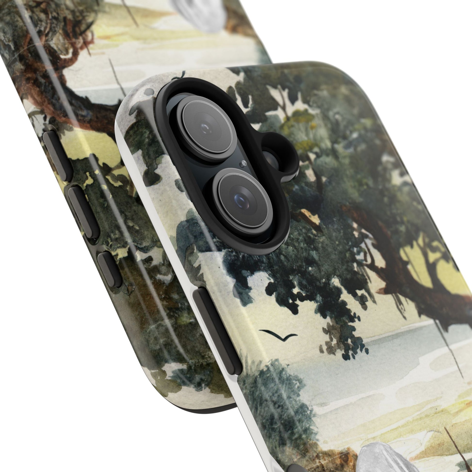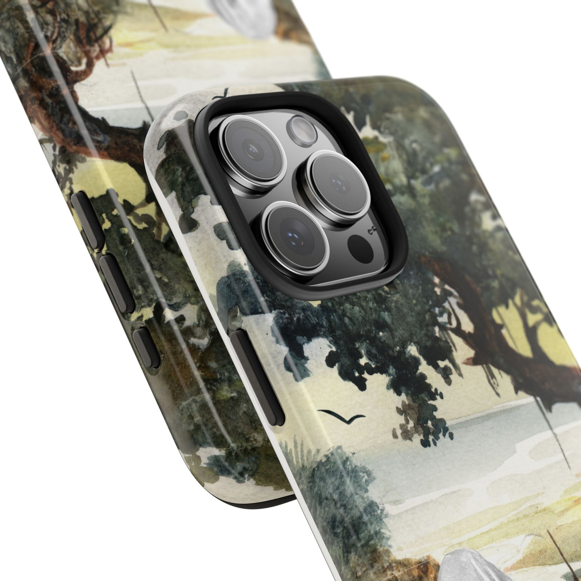 Watercolor Nature Phone Case with Woman by the Sea Tree and Boat Serene Landscape Art Protective Cover for Calm Coastal and Artistic Vibes