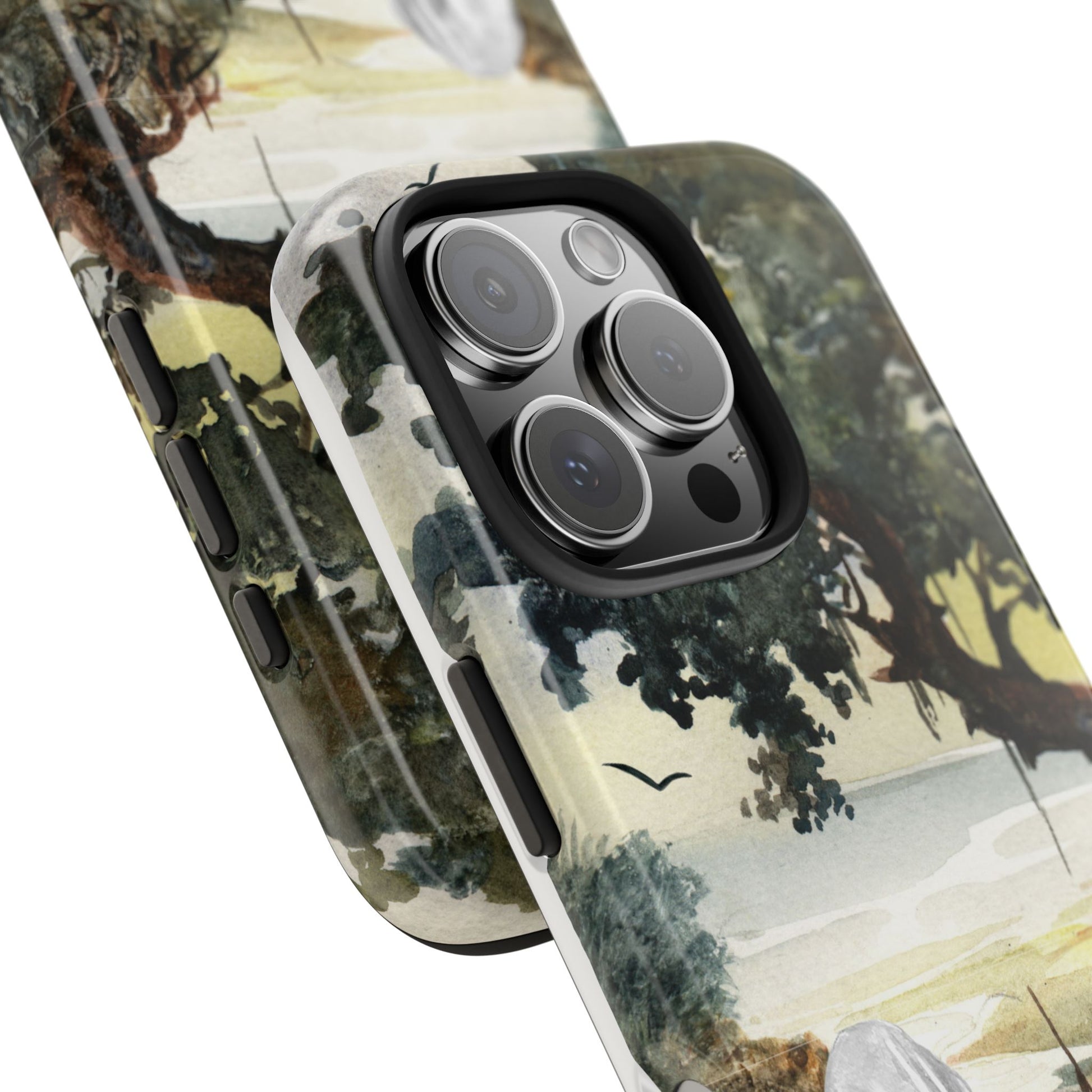 This beautifully illustrated phone case features a peaceful coastal scene with a woman in a headscarf gazing at a quiet shore with trees boats and birds ππ³. Perfect for those who love reflective art nature scenery and serene storytelling through design